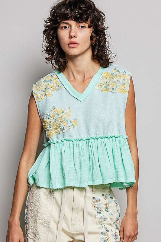 Floral Patch Ruffled Sleeveless Top with Raw Edge Detail