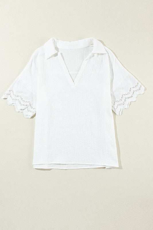 Embroidered Eyelet Gauze Collared V-Neck Blouse
