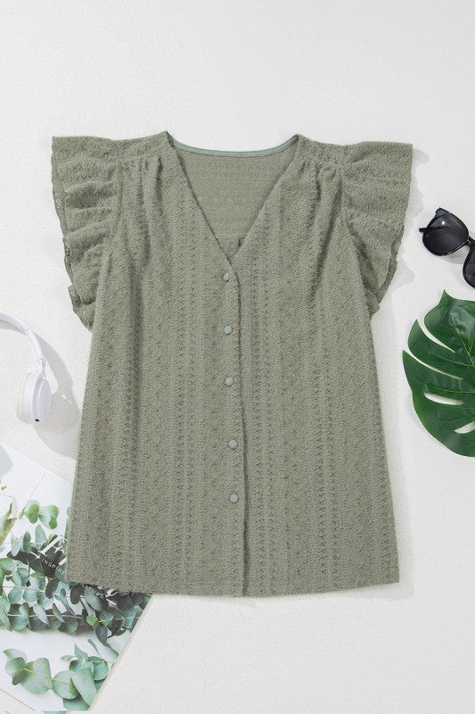 Lace Textured Flutter Sleeve Buttoned V-Neck Shirt