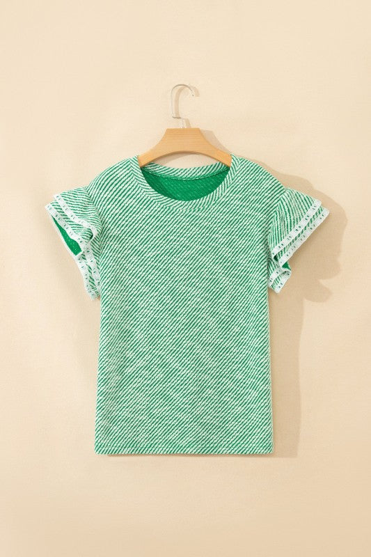 Wavy Stripe Ruffle 3/4 Sleeve Crochet Sweater