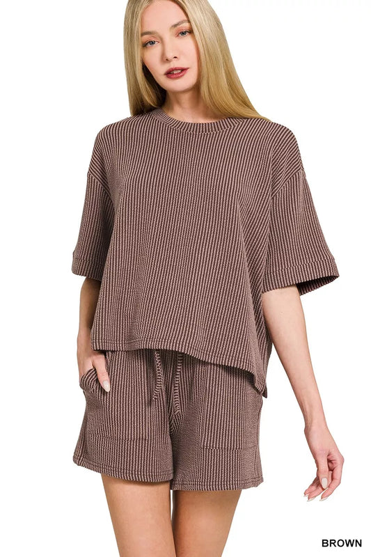 Raised Rib Short Sleeve Tee and Drawstring Shorts Set