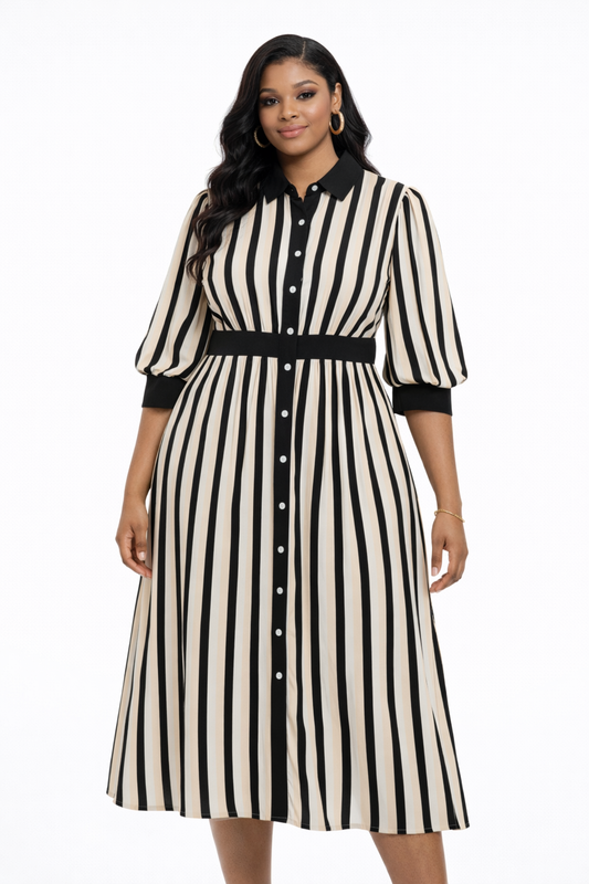 Stripe 3/4 Puff Sleeve Button Midi Dress